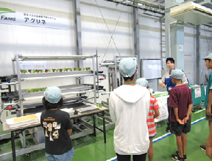 野菜の苗を植え替える、垂直搬送ロボットの動きを間近でご覧いただきました。