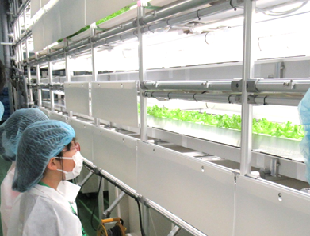 白衣に着替え、実際にアグリネの中に入って見学です。完全人工光型で生育した野菜をご覧いただきました。