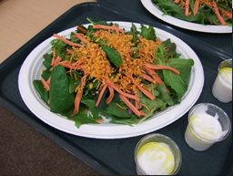 ①サラダかまぼこやスナック菓子を載せたサラダ