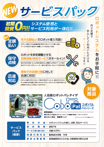 ![]() | 「ロボット導入が初めてで、何か起きた際の対処法が分からない」 「導入後のメンテナンス頻度・費用が分からない」 「ロボットを導入したくても、設備投資予算に限りがあって導入できない」 このようなお客様のお困りごとを解決するのが「サービスパック」です。 詳細はこちら | |